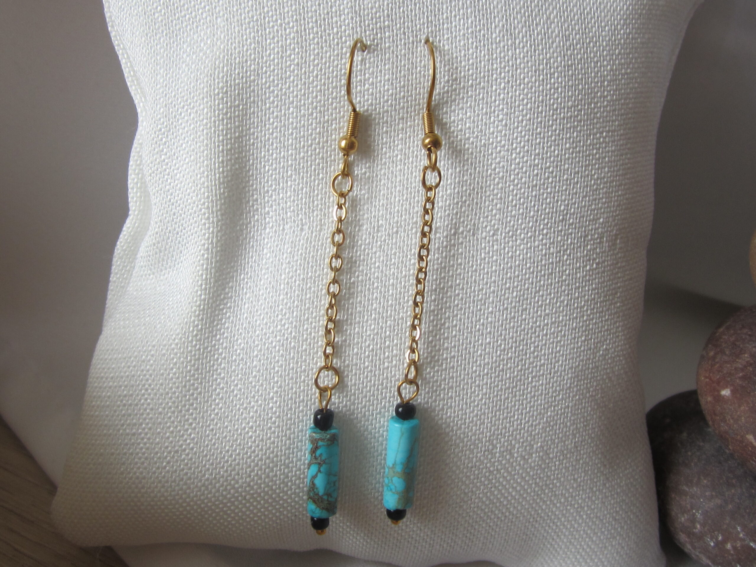 Boucles d’oreilles de Turquoise, Perle naturelle de forme cylindrique, montée sur chainette inox dorée.