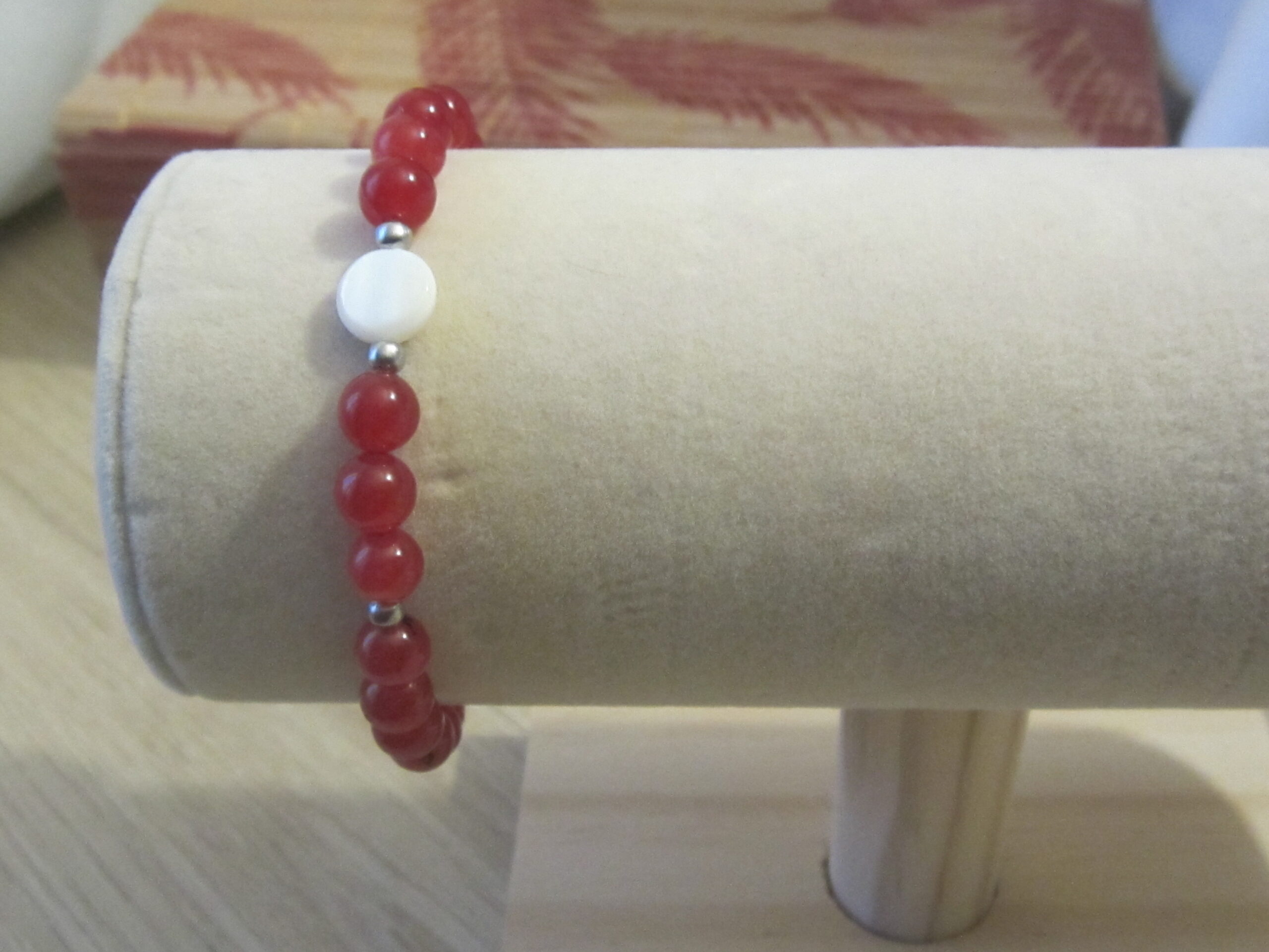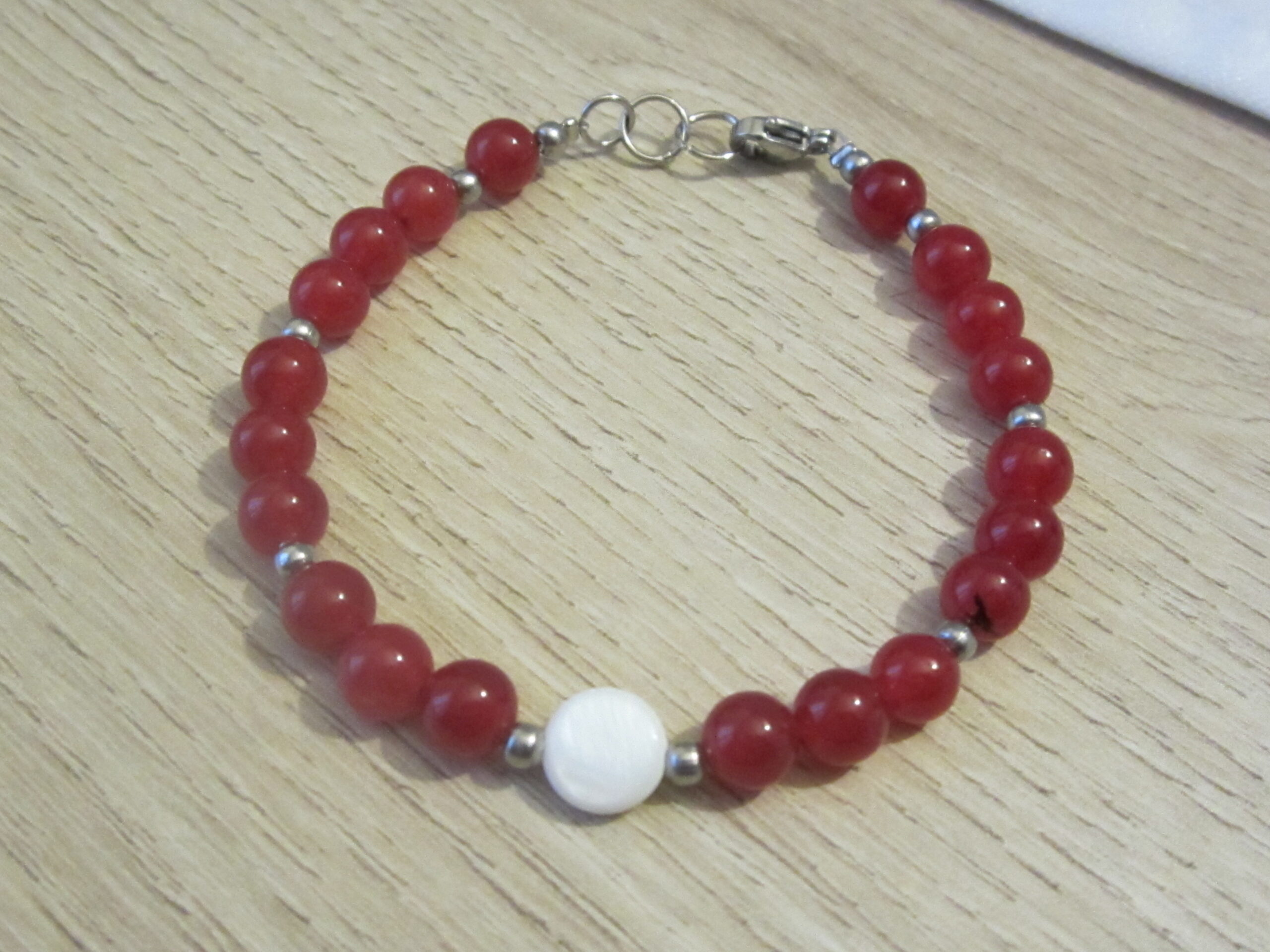 Bracelet de perles de Jade Rouge, une perle centrale de Nacre et des petites perles d’inox. Ce bracelet monté sur fil d’acier et fermoir en acier inoxydable. Bracelet assemblé à la main dans notre atelier dans les Vosges.