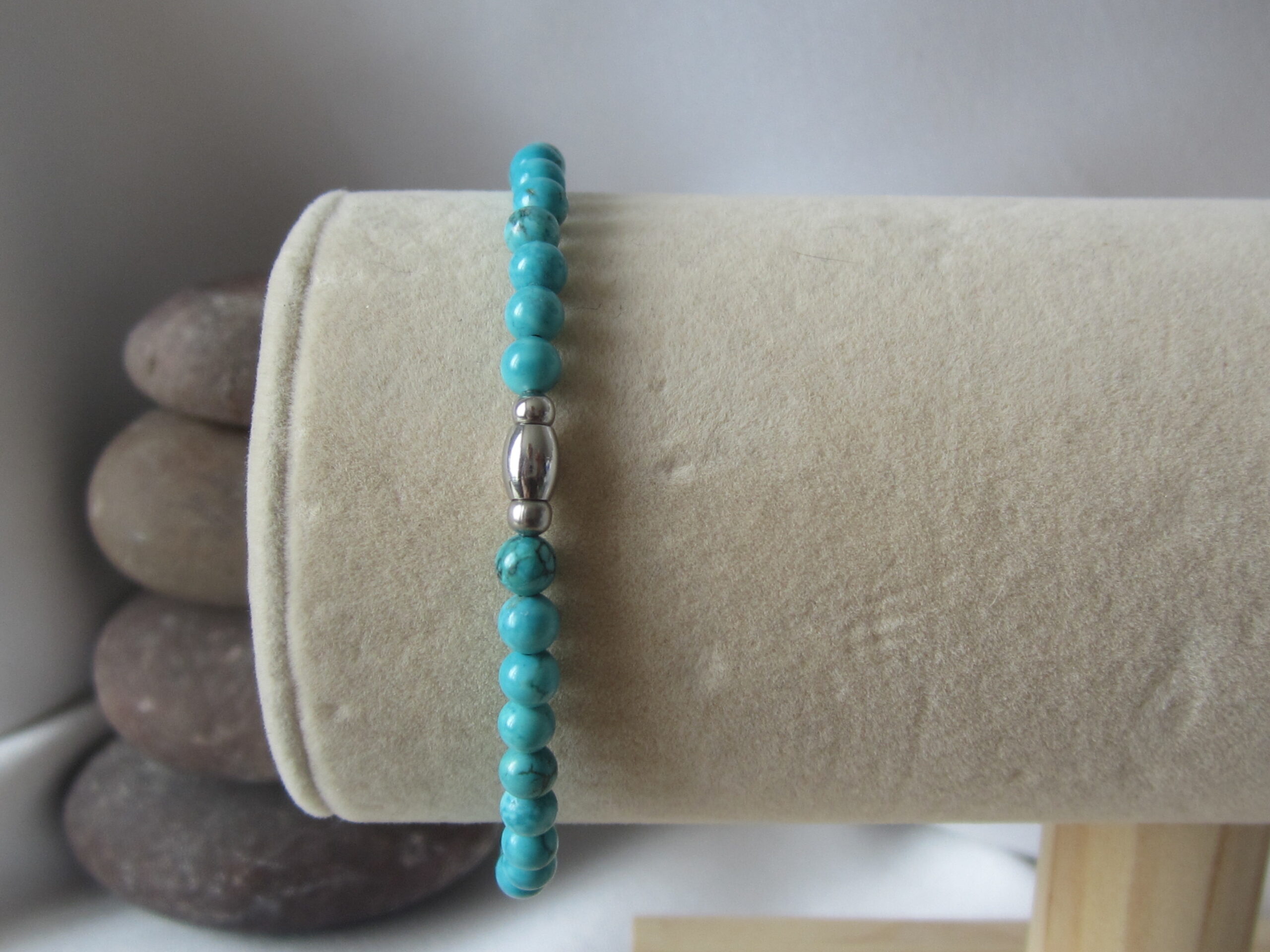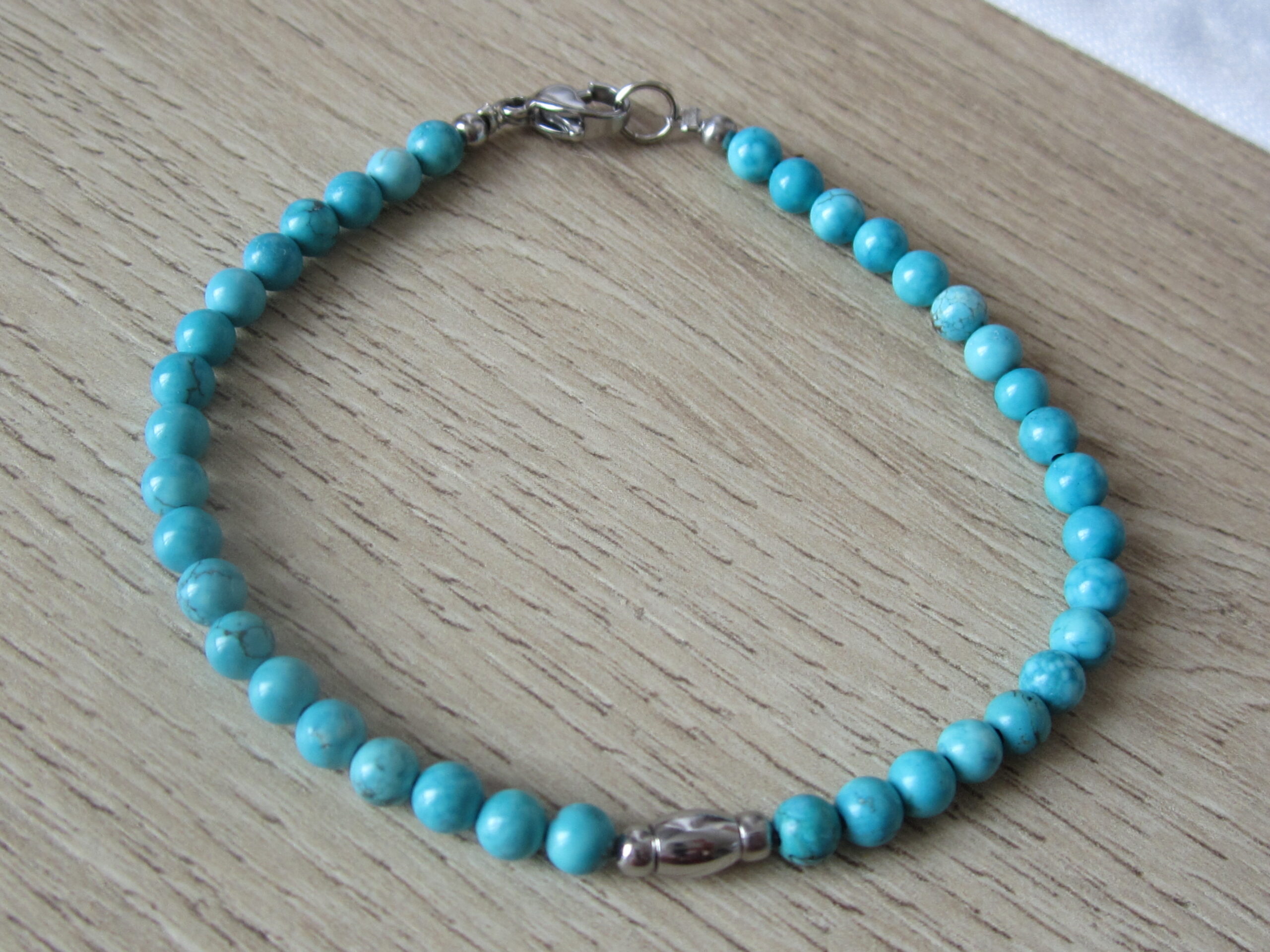 Bracelet de Turquoise naturelle. Perles fines (4 mm) de Turquoise et de petites perles en acier inoxydable, montées sur fil et fermoir en acier inoxydable.