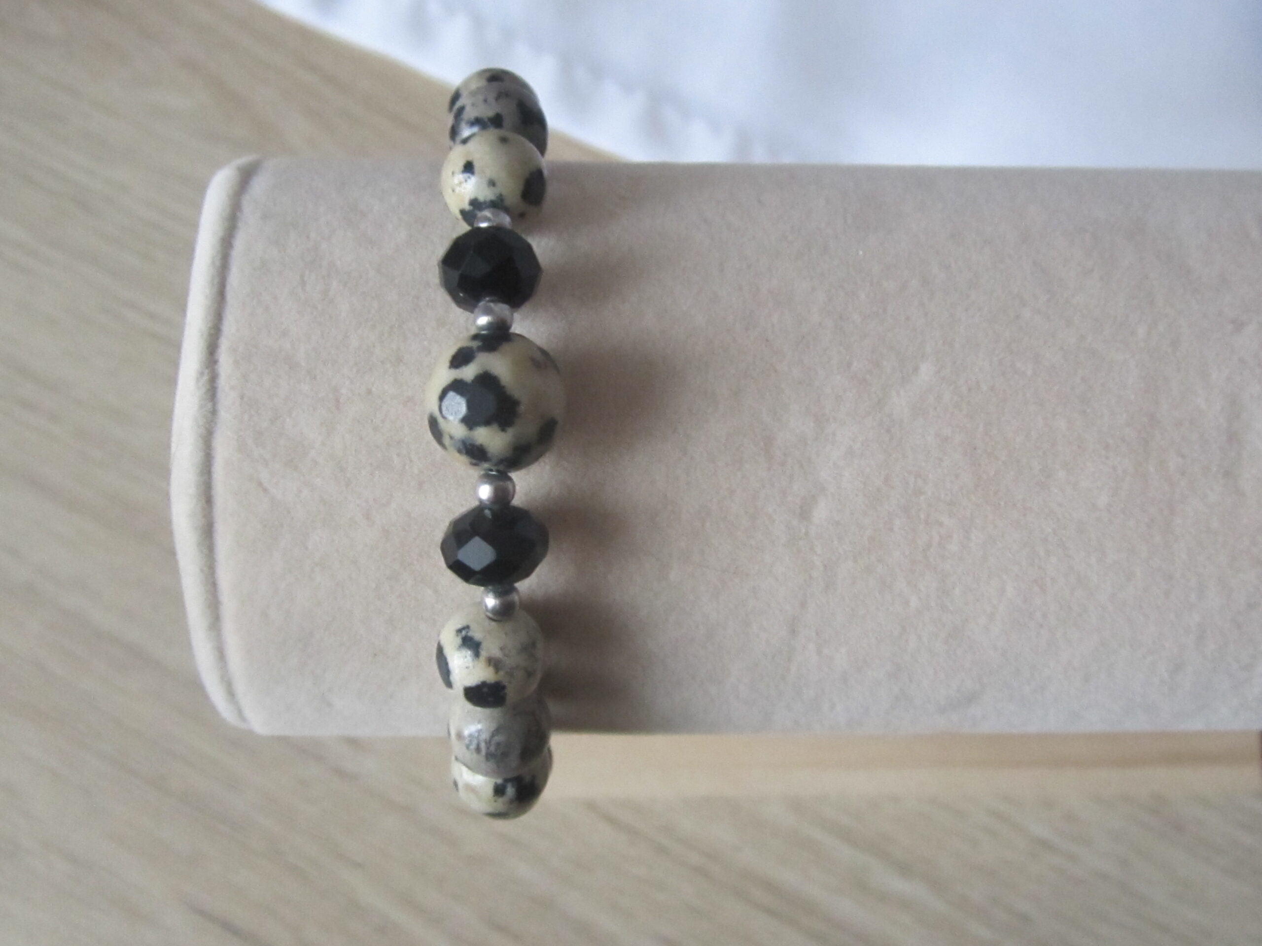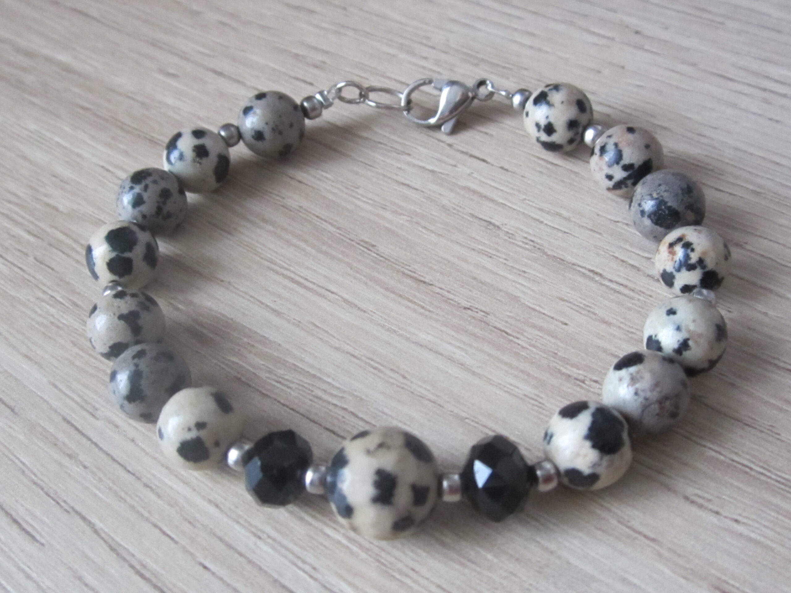 Bracelet Jaspe Dalmatien et deux perles cristal noires, de taille 8 et 10 mm de la perle centrale, monté sur fil d’acier et fermoir inox, assemblé à la main dans notre atelier dans les Vosges.