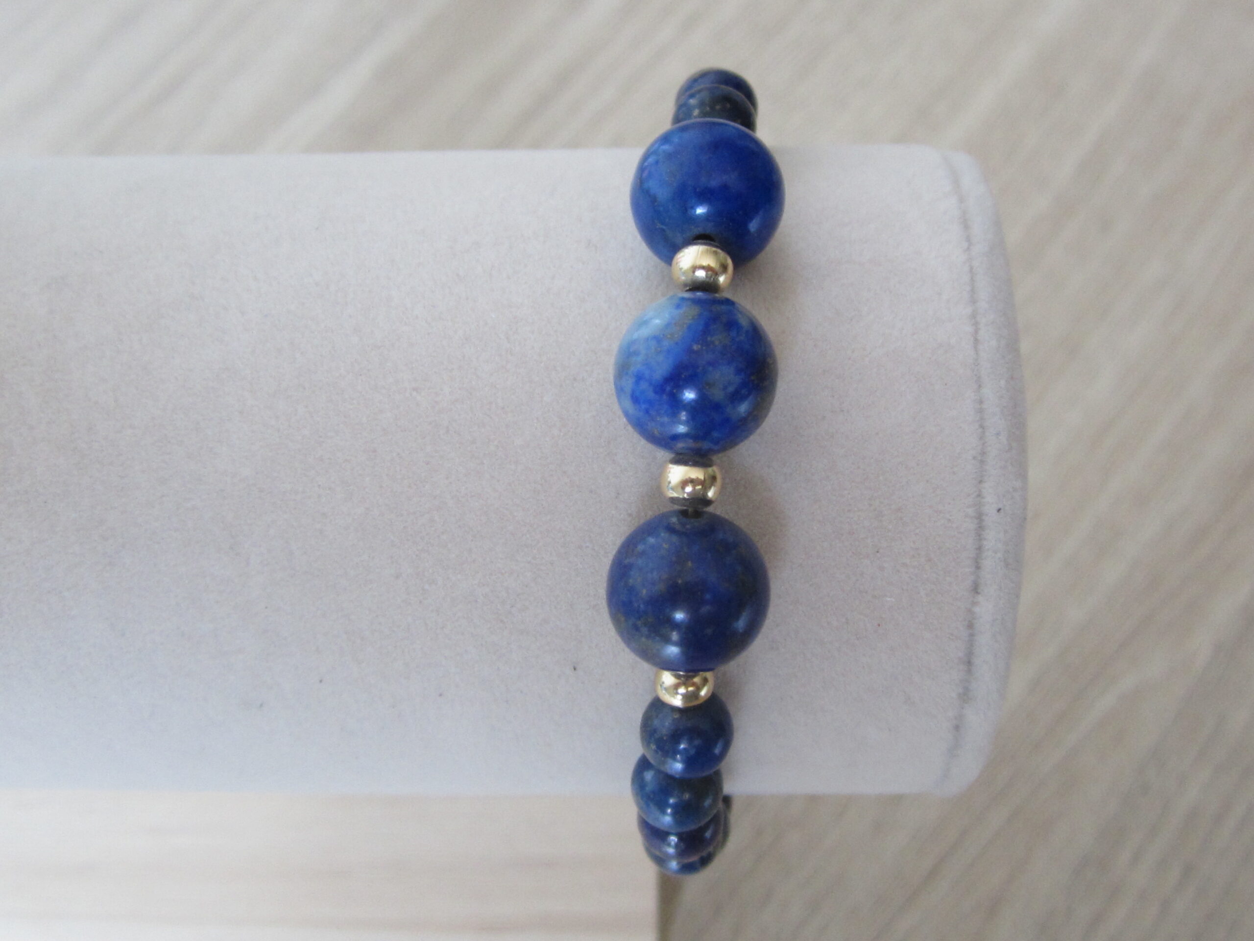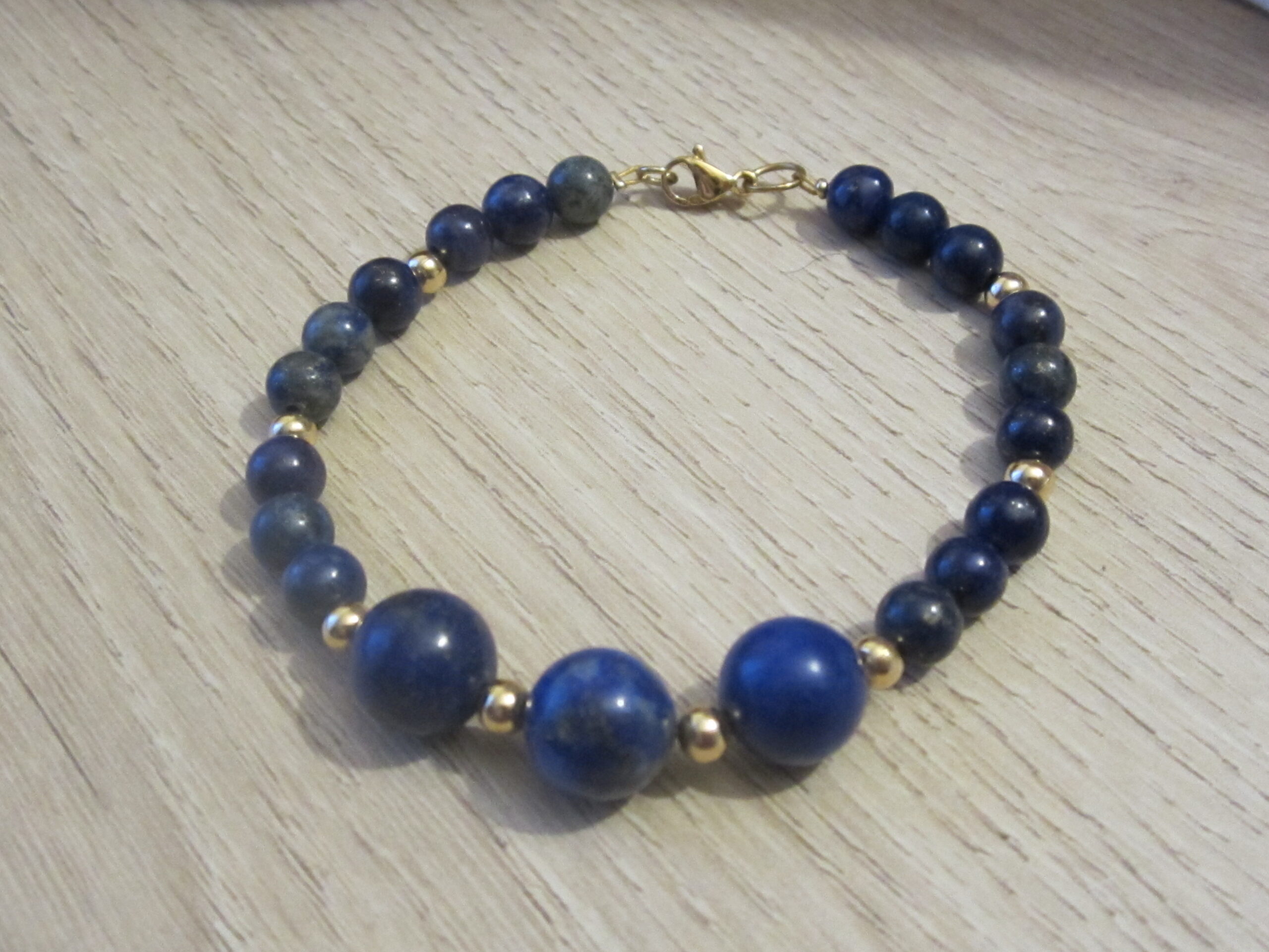 Bracelet de perles de Lapis Lazuli de taille 6 et 10 mm, montées sur fil d’acier et fermoir inox doré.