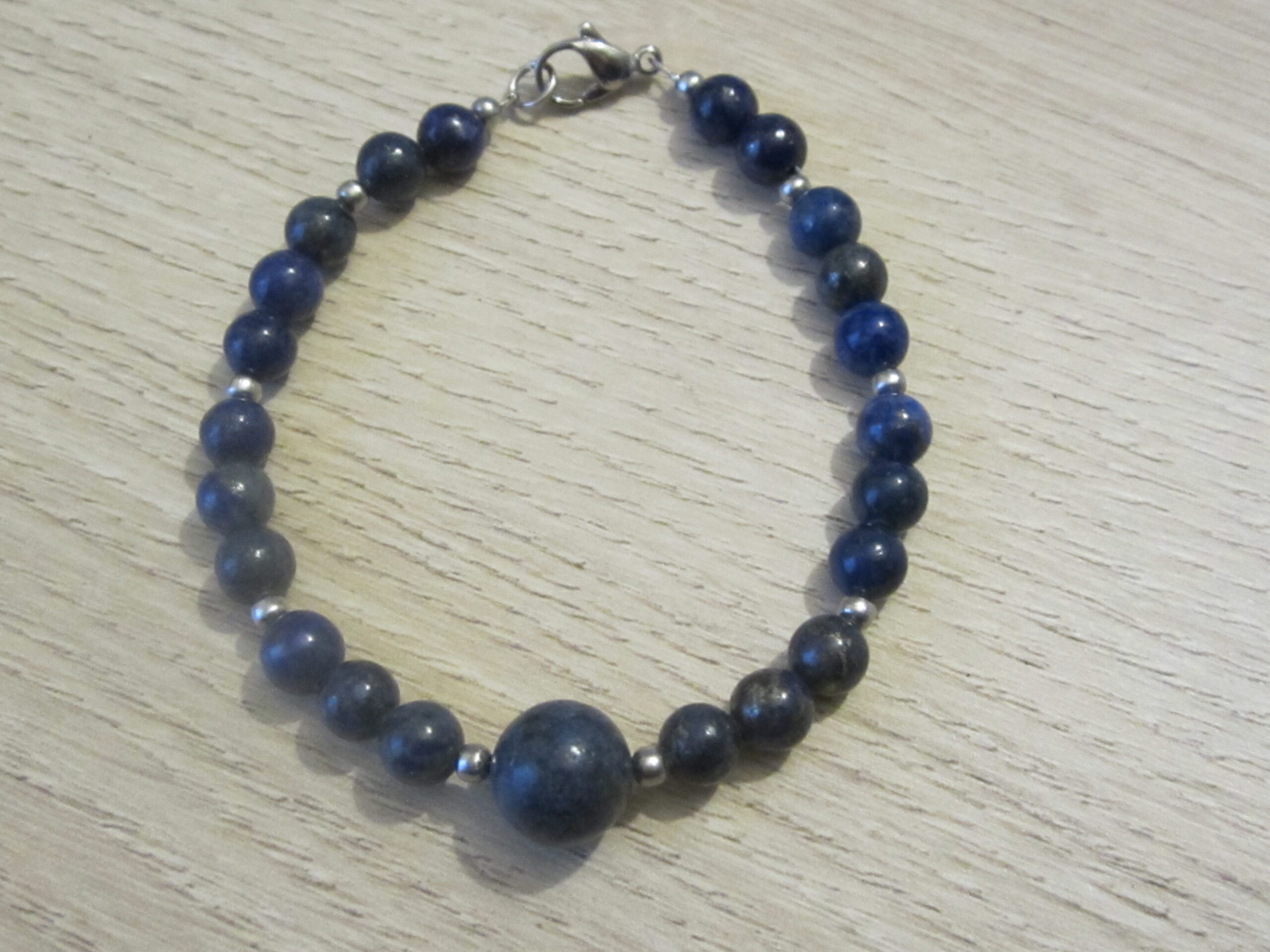 Bracelet de perles de Lapis Lazuli, 6 et 8 mm, de petites perles en acier inoxydable, montées sur fils d’acier et fermoir en acier inoxydable.