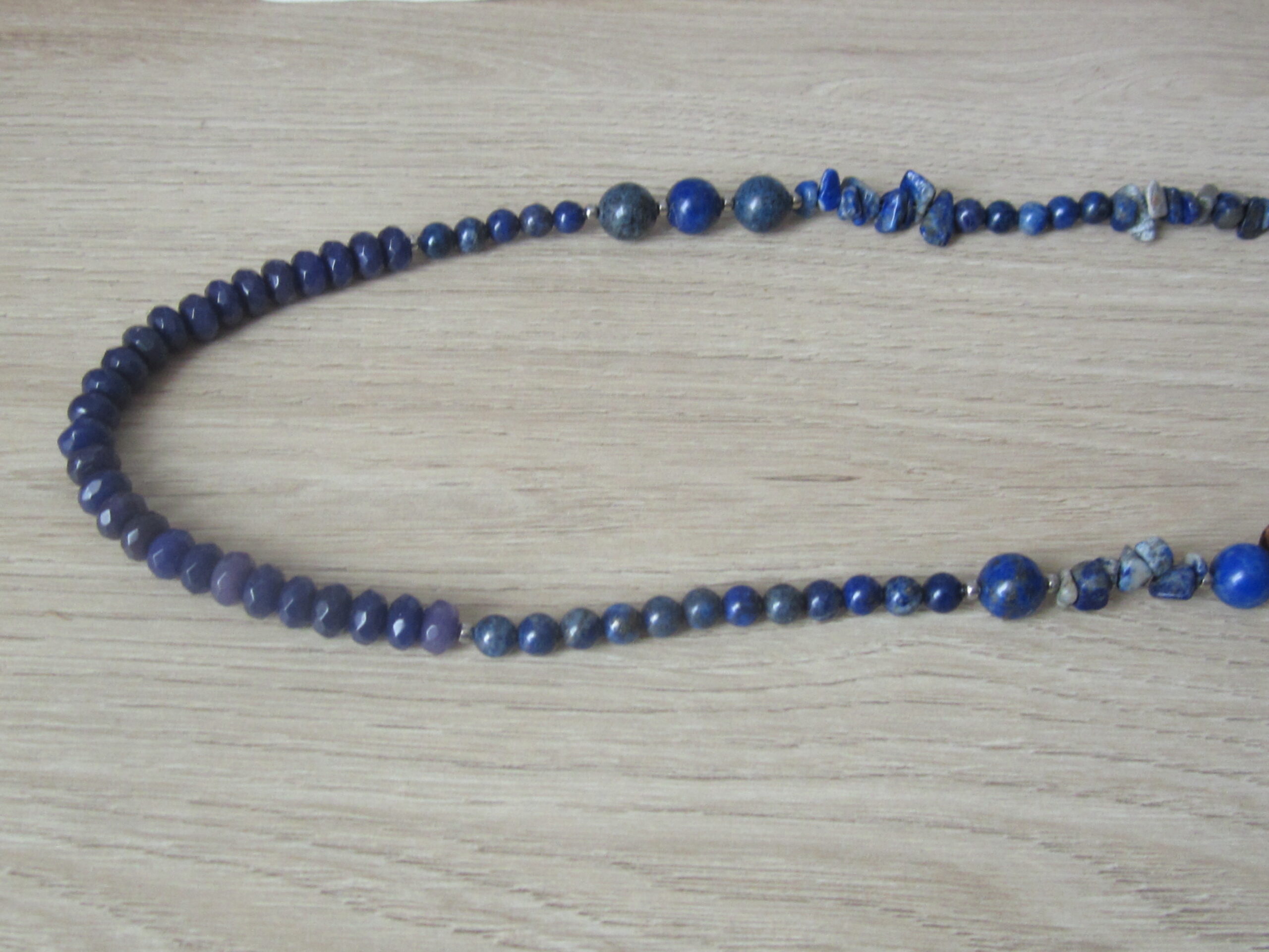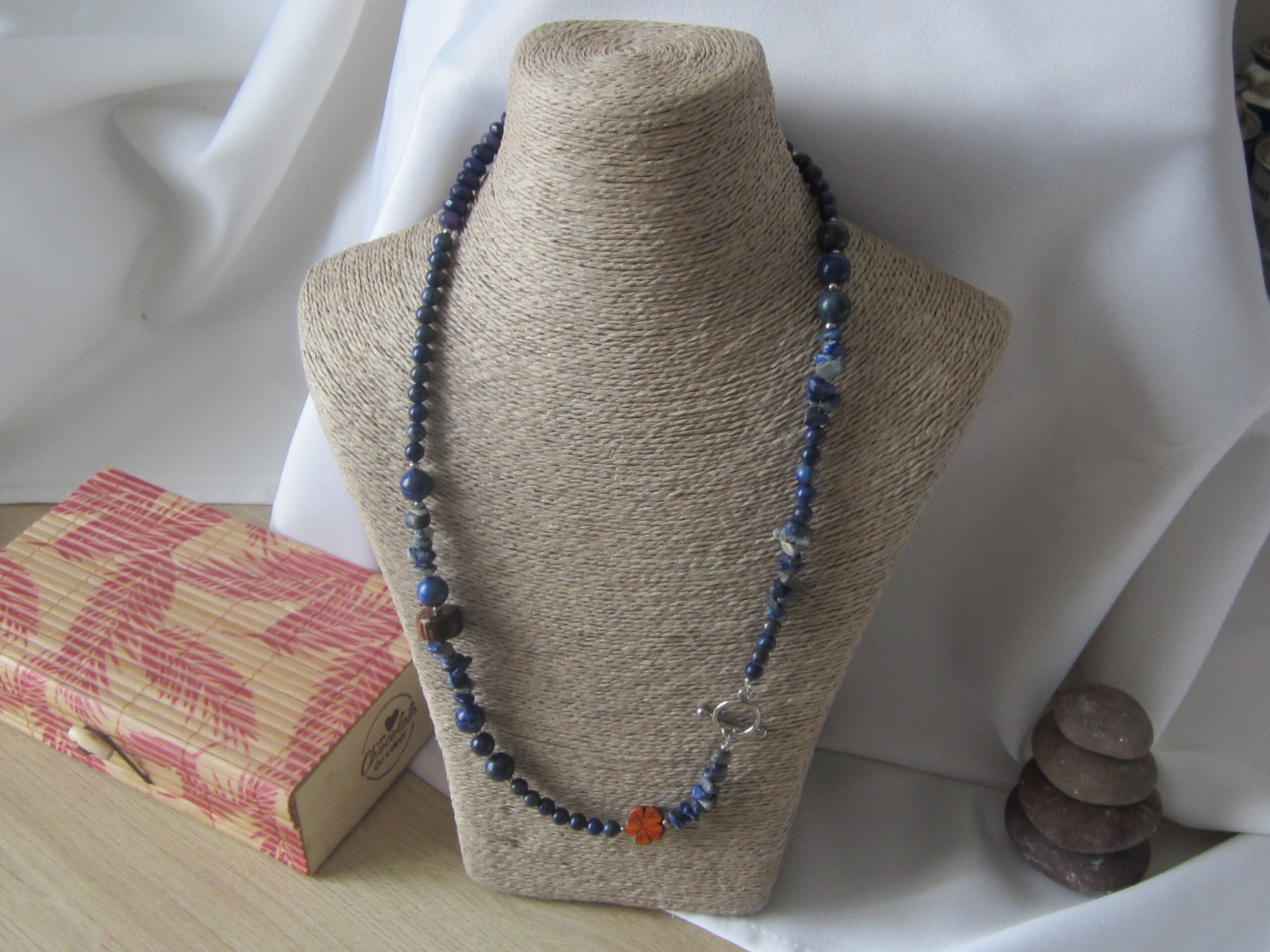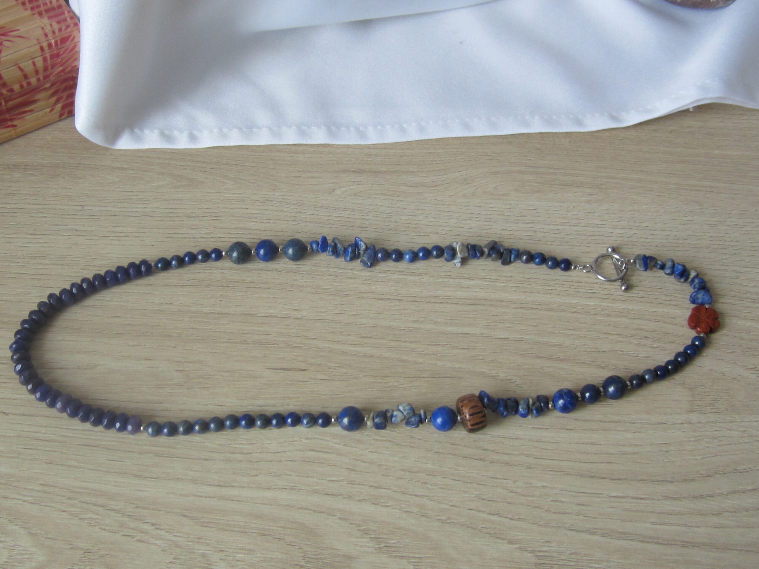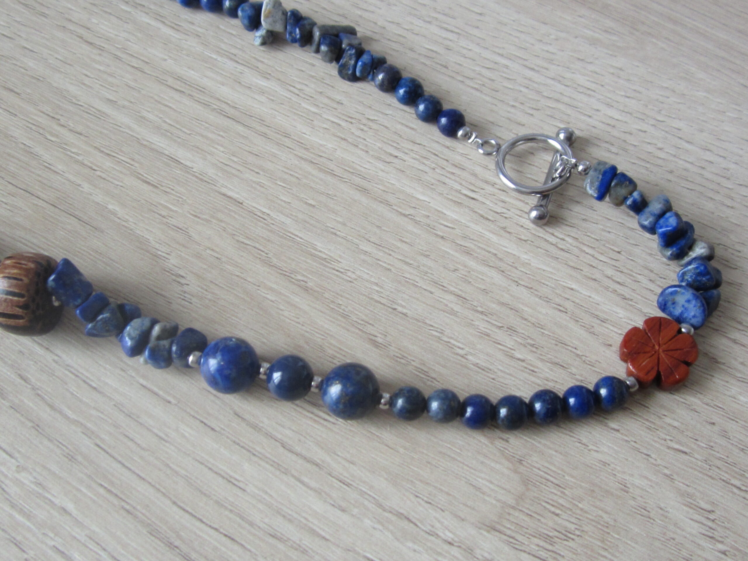 Collier de perles naturelles de Lapis Lazuli, perles de bois, perles inox, collier monté sur fil d’acier et fermoir inoxydable, assemblé à la main dans notre atelier dans les Vosges.